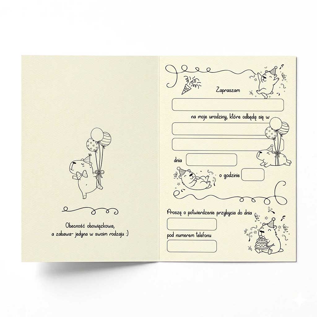 Wewnątrz znajduje się czytelny tekst do samodzielnego uzupełnienia (data, miejsce, godzina, kontakt), uzupełniony delikatnymi rysunkami kapibary, które nadają całości lekkości, ale nie infantylności.