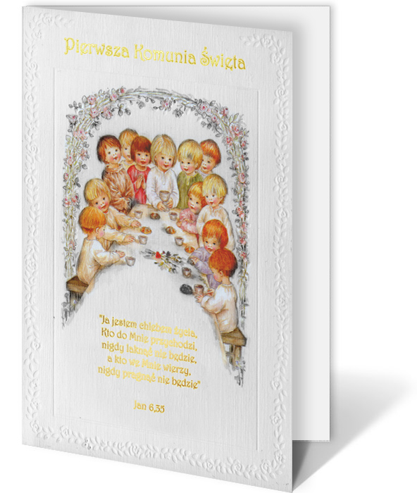 Eleganckie zaproszenie komunijne wykonane z wysokiej jakości matowego papieru. Na okładce znajduje się kolorowy, subtelnie wykonany nadruk przedstawiający dzieci przy wspólnym stole, otoczony misternie tłoczonym szlaczkiem, który nadaje zaproszeniu wyjątkowego uroku. Całość wzbogacona została złoconymi napisami, które podkreślają podniosłość uroczystości.