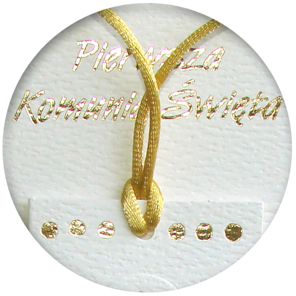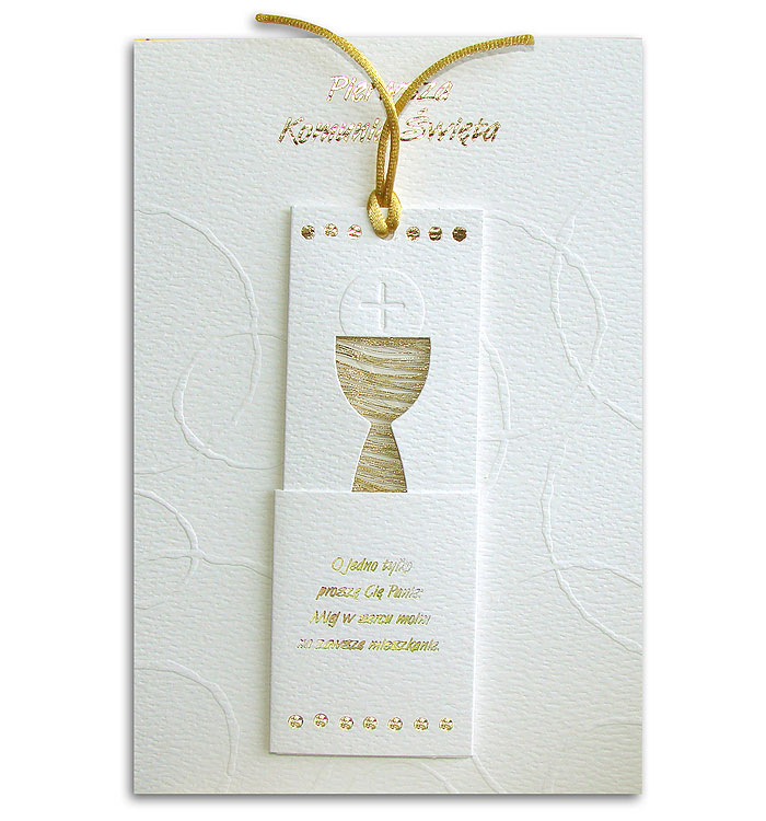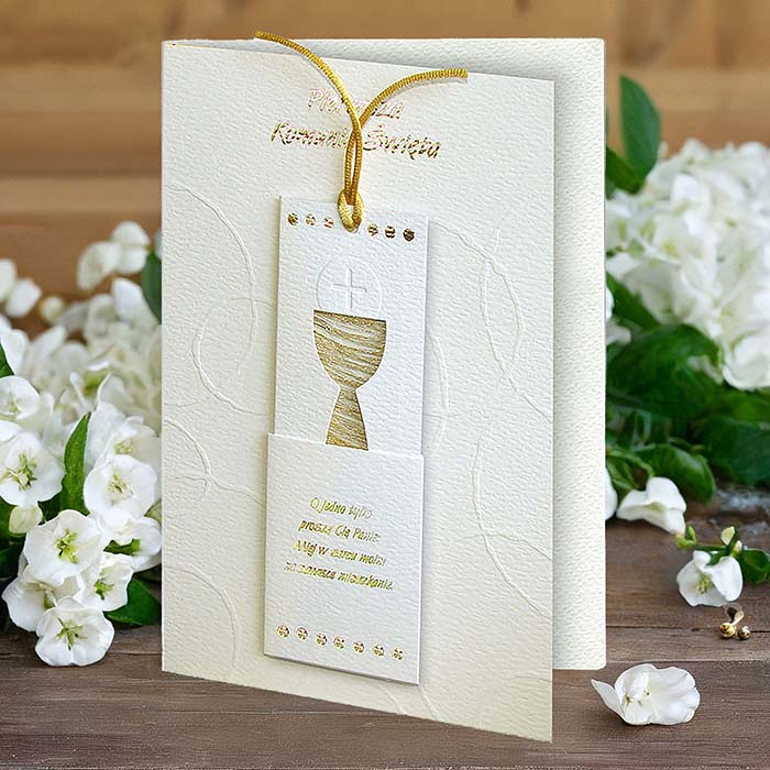 Eleganckie i subtelne zaproszenie komunijne wykonane z wysokiej jakości matowego, fakturowanego papieru. Na okładce znajduje się delikatne tłoczenie, które nadaje kartce wyjątkowego charakteru. Dodatkowym elementem dekoracyjnym jest naklejona kieszonka, do której wsuwana jest ozdobna karteczka z precyzyjnie wyciętym laserowo kielichem oraz złotym sznurkiem atłasowym.